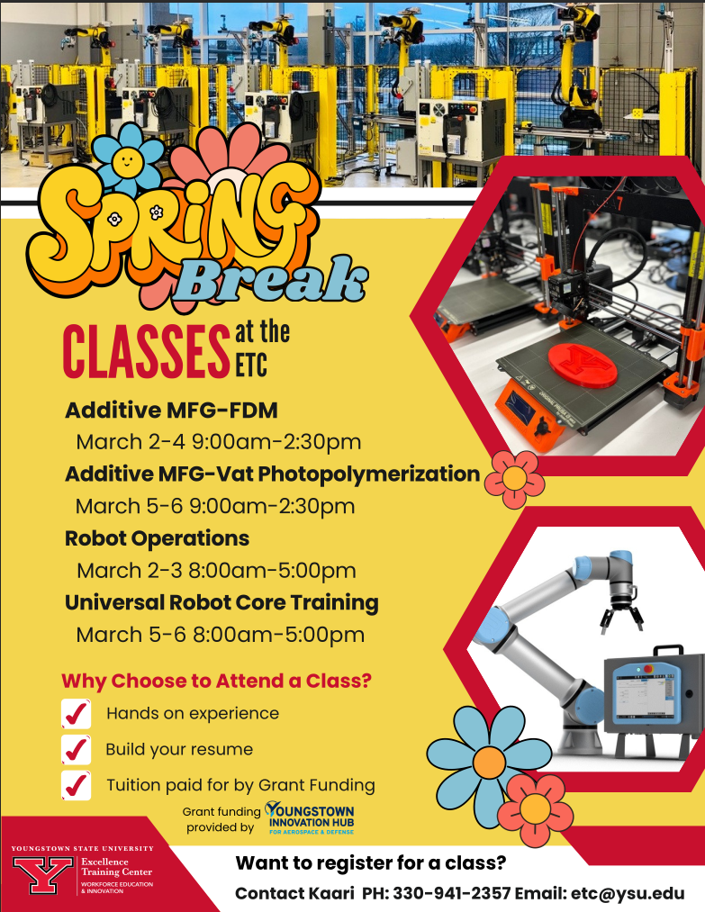 Because workforce classes at the Excellence Training Center (ETC) typically run five to eight hours per day, they don’t always fit easily into a traditional semester schedule. To make these hands-on learning opportunities more accessible, four workforce classes will be offered at the ETC during spring break specifically for YSU students.