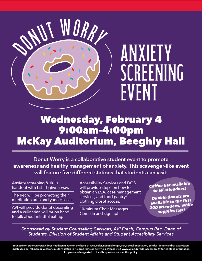 What: Donut Worry is a collaborative student event to promote awareness and healthy management of anxiety. This scavenger-like event will feature five different stations that students can visit:
